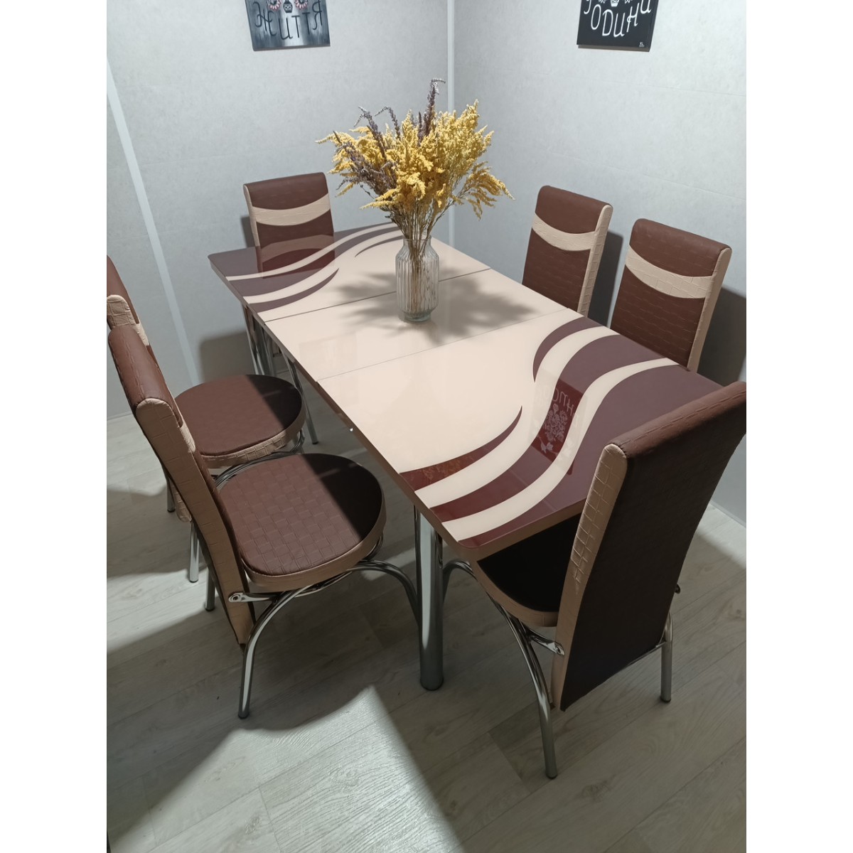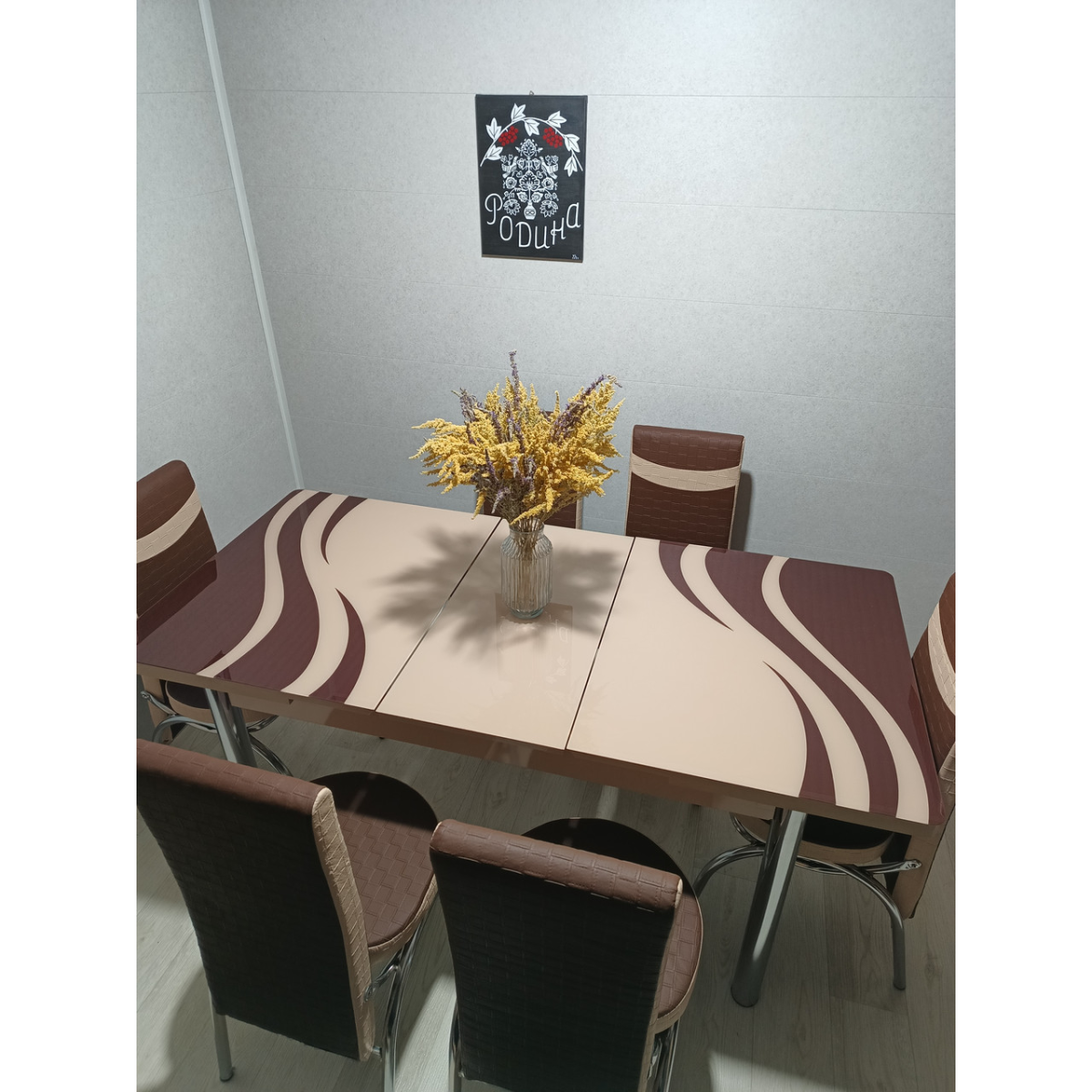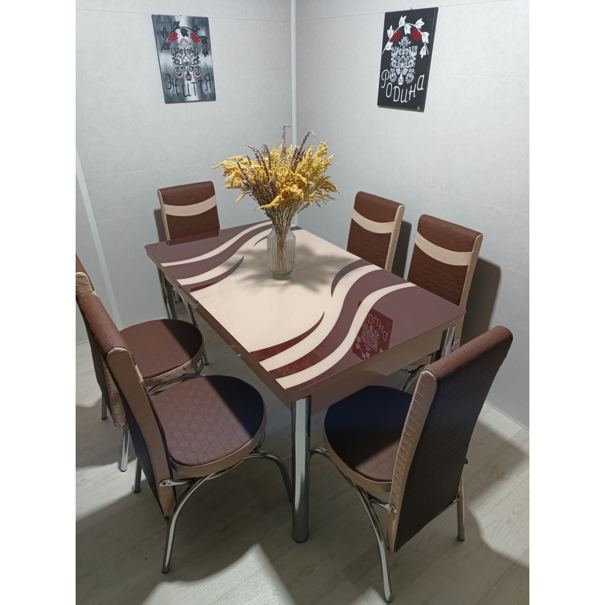 Комплект меблів для кухні з оригінальним декором! Розкладний стіл (130 см (+40 см) * 80 см) і 6 стільців!
