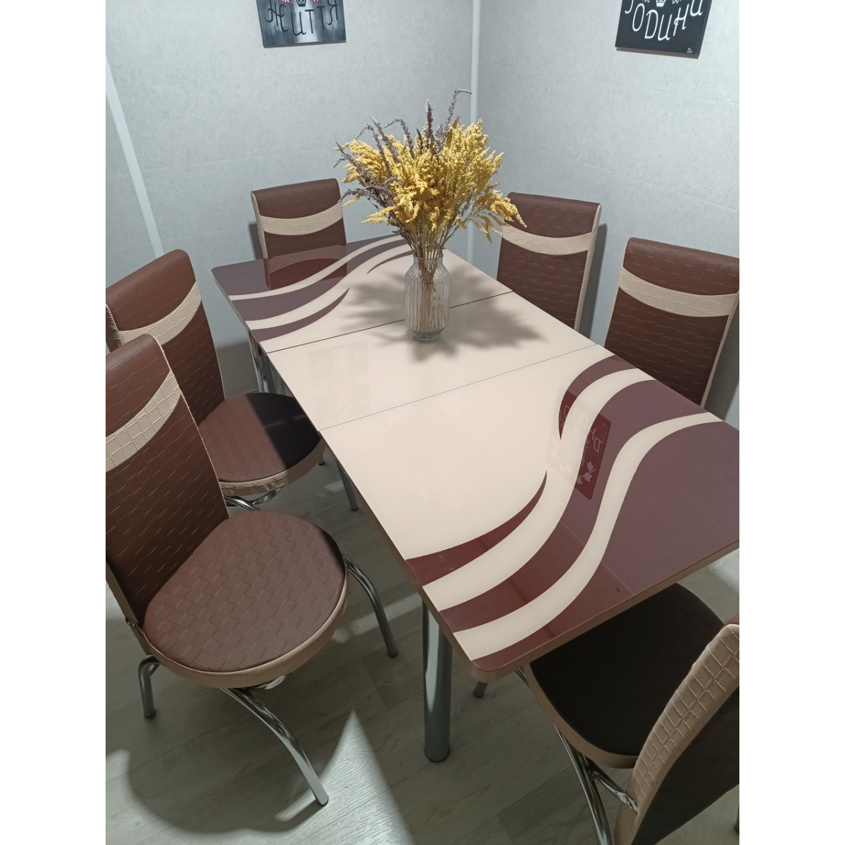 - Ніжки столу та стільців виготовлені з хромованої сталі із заглушками — Високоякісний фотодрук на стільницях