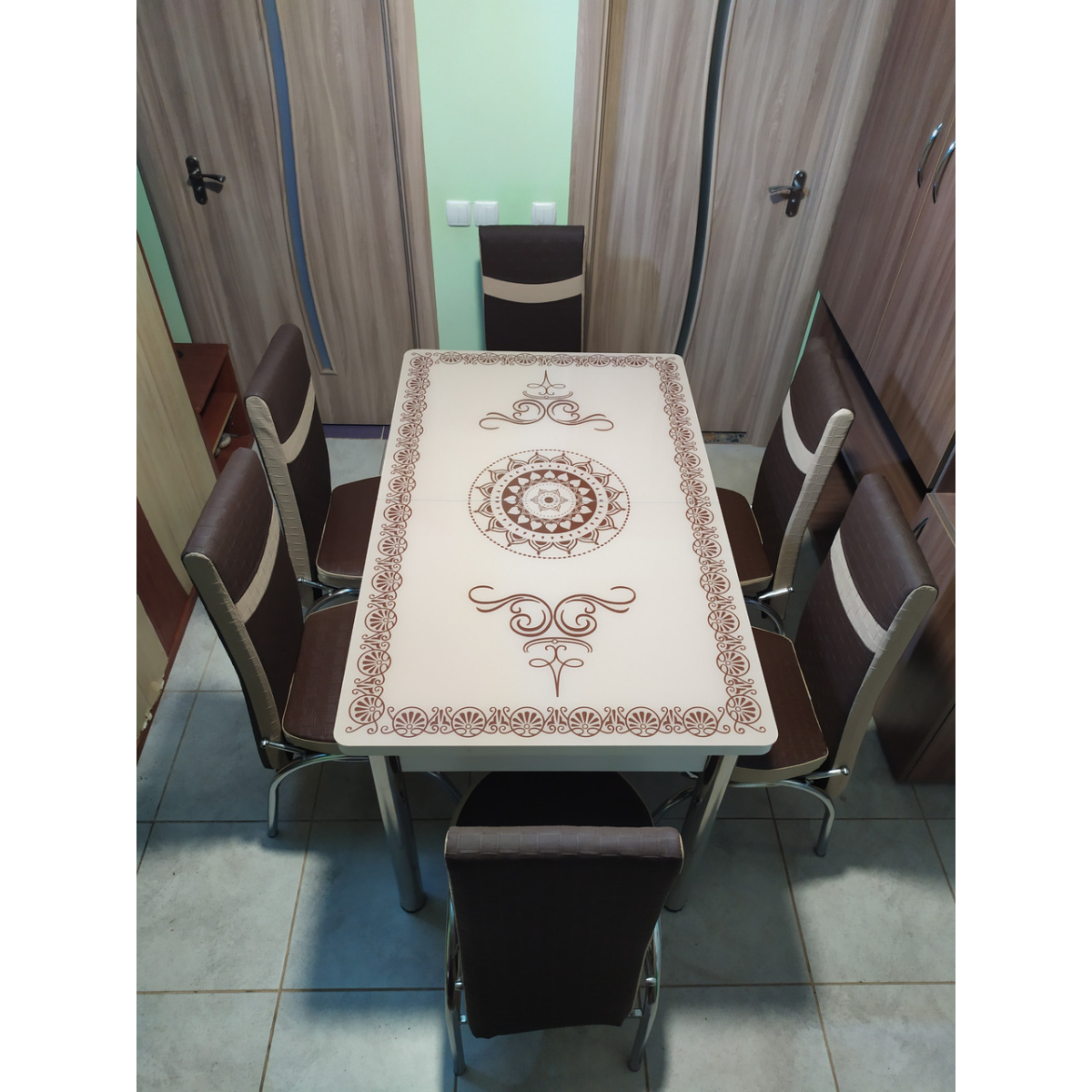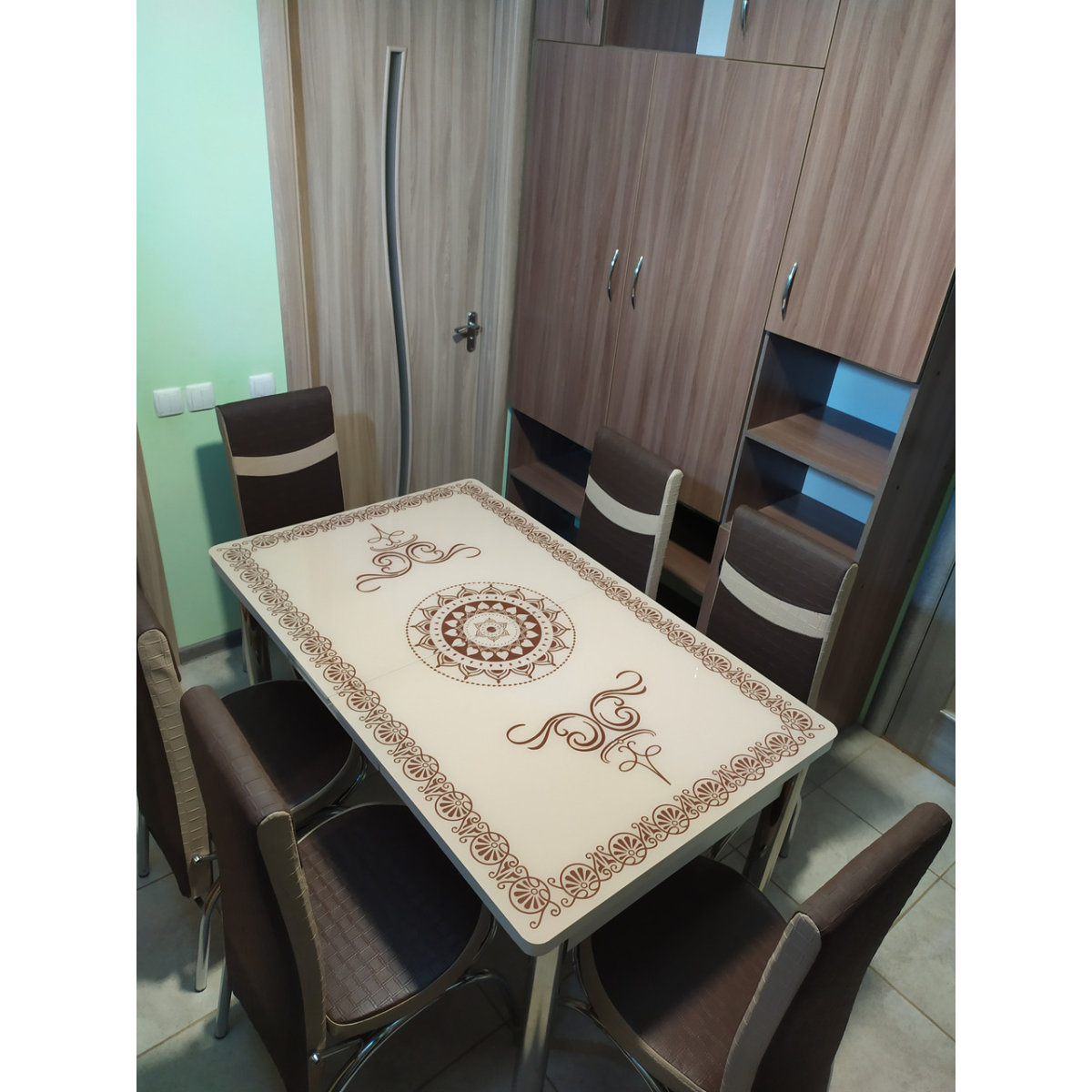 Комплект меблів для кухні з оригінальним декором! Розкладний стіл (130 см (+40 см) * 80 см) і 6 стільців!