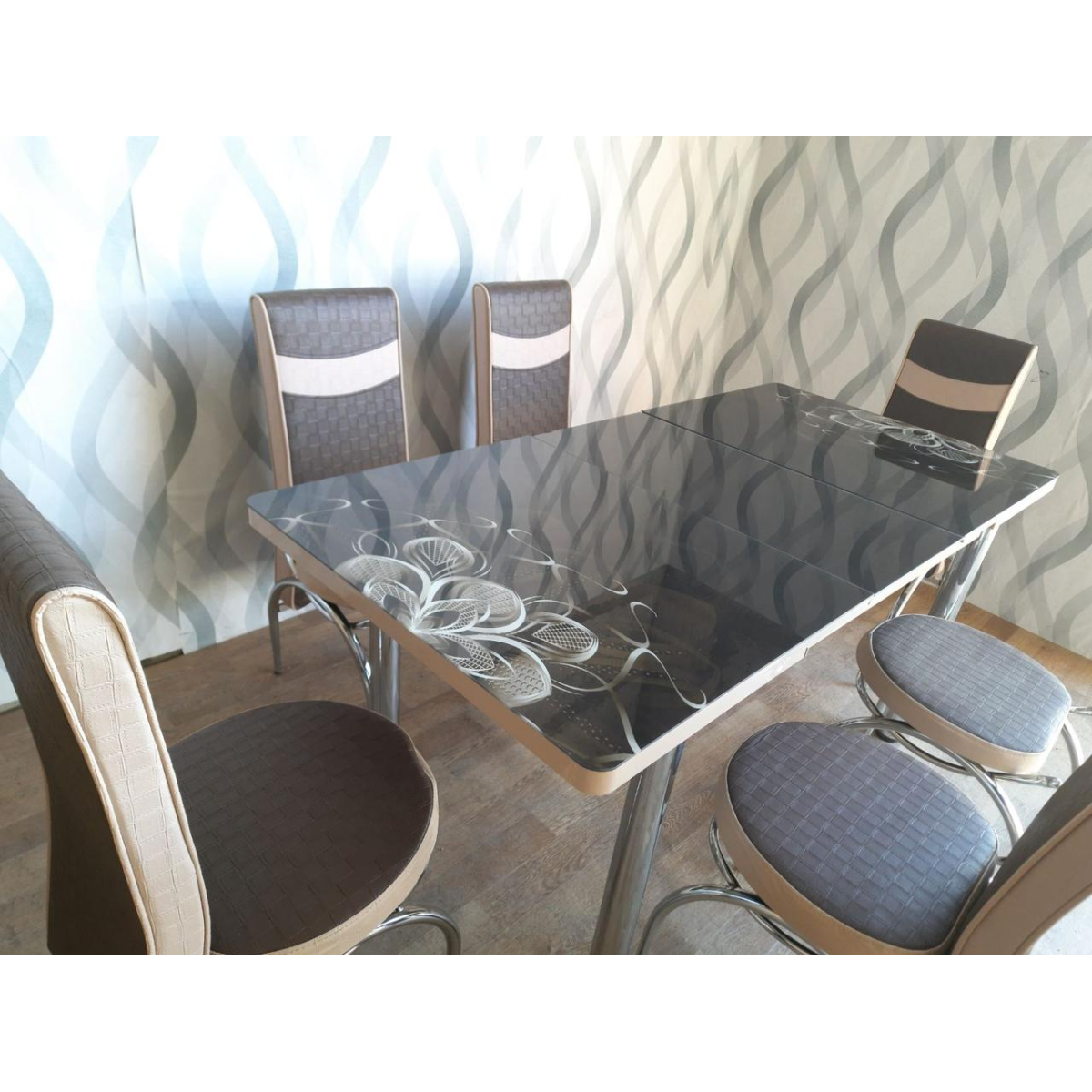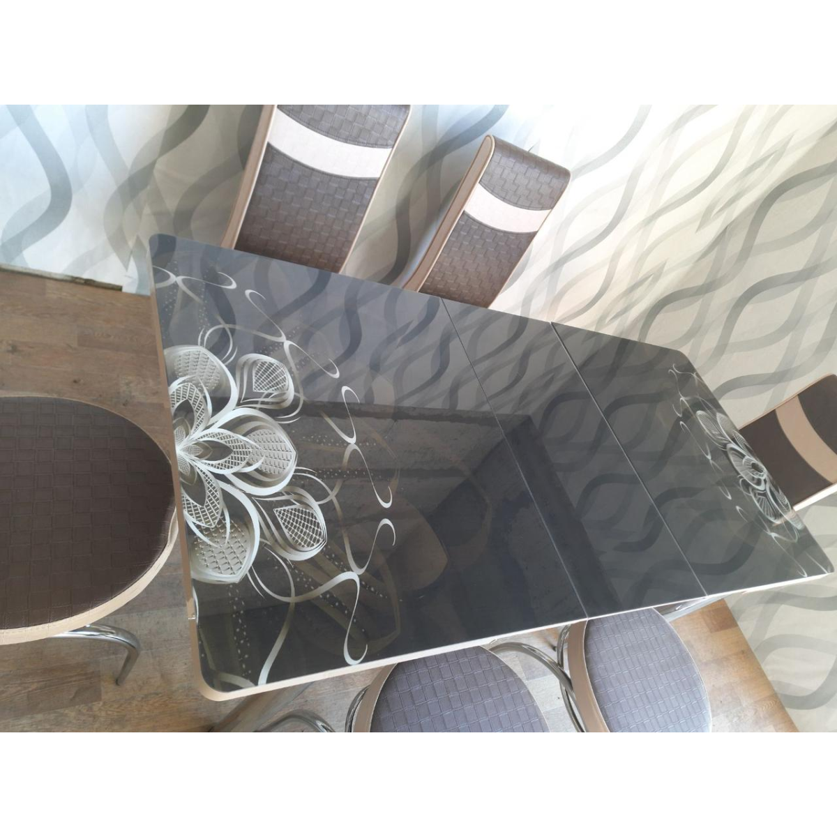Комплект меблів для кухні з оригінальним декором! Розкладний стіл (130 см (+40 см) * 80 см) і 6 стільців!