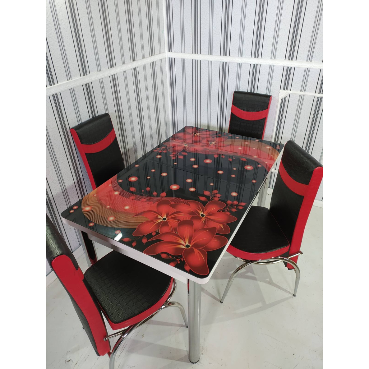 - Ніжки столу та стільців виготовлені з хромованої сталі із заглушками — Високоякісний фотодрук на стільницях