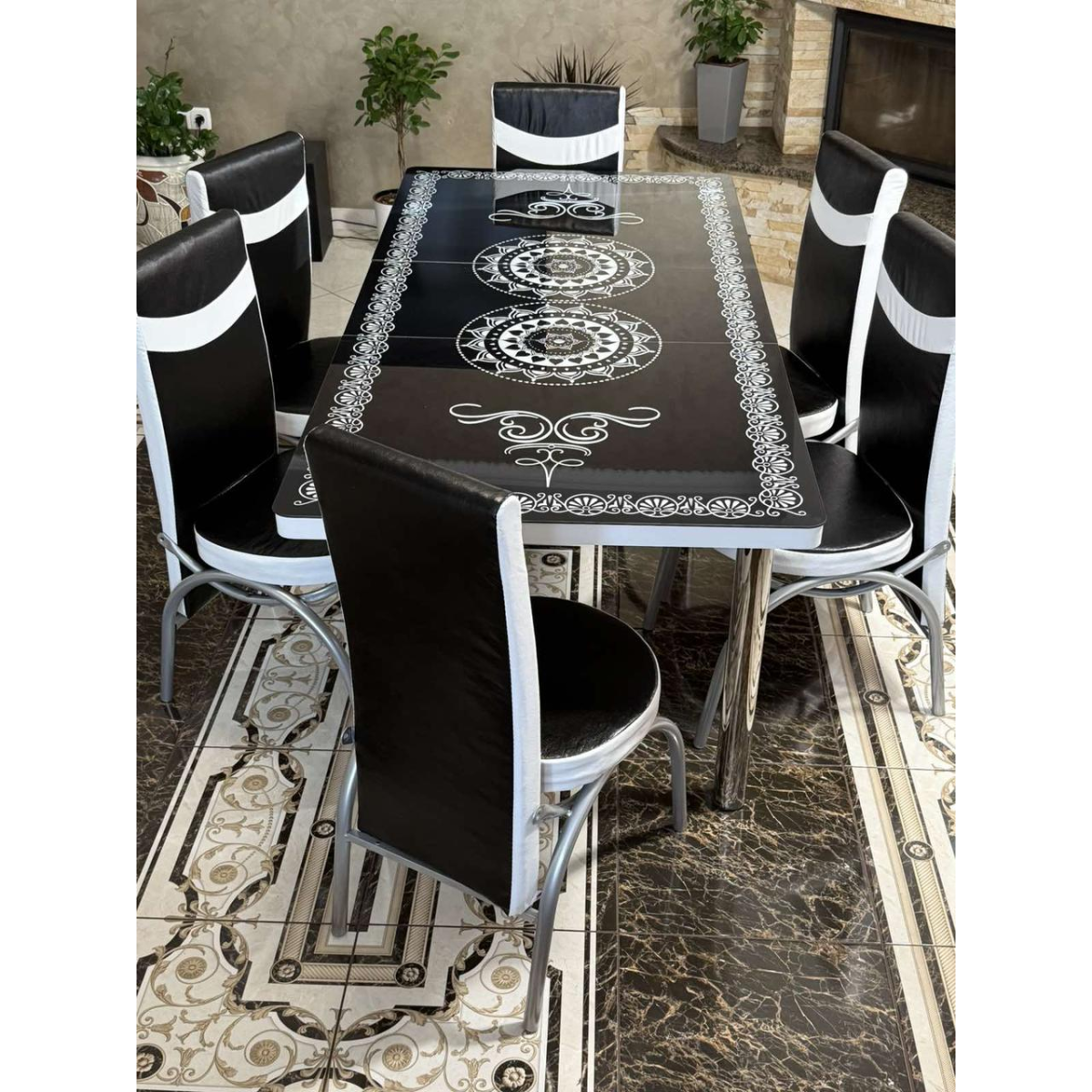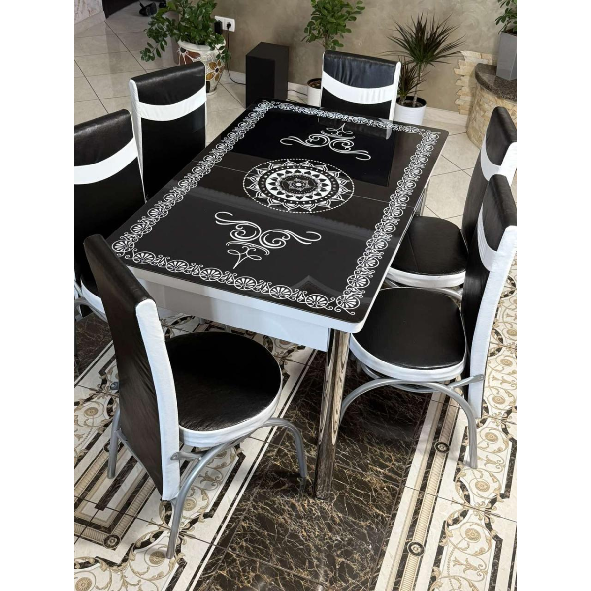 - Ніжки столу та стільців виготовлені з хромованої сталі з заглушками