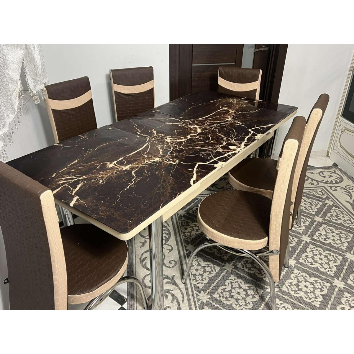 - Ніжки столу та стільців виготовлені з хромованої сталі із заглушками — Високоякісний фотодрук на стільницях і стільцях
