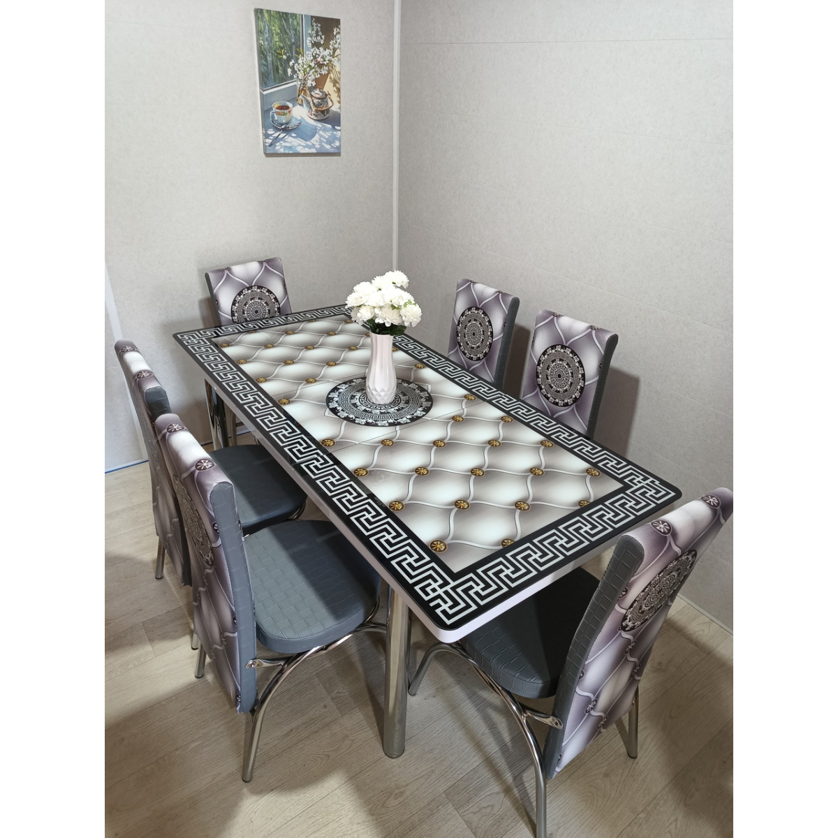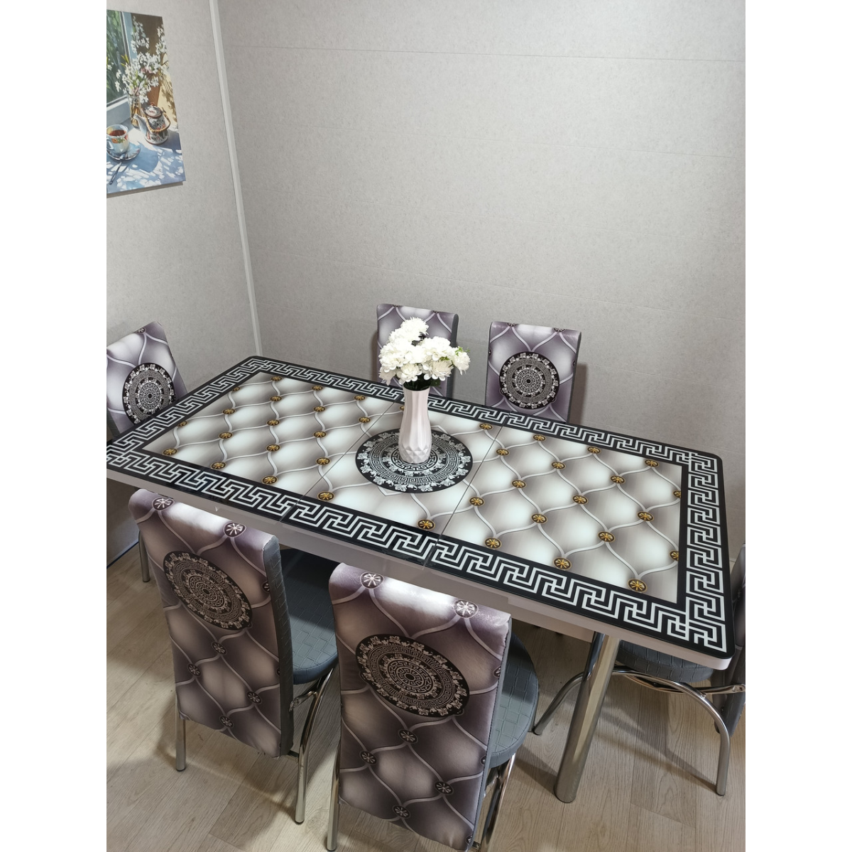 - Ця модель стола зроблена з міцного загартованого скла, захищеного від механічних пошкоджень з 3-д малюнком, каркас стола виготовлений із металевої конструкції, яка міцно скручується з металевими ніжками та з часом не розхитується - Ніжки столу та стільців виготовлені з хромованої сталі із заглушками — Високоякісний фотодрук на стільницях і стільцях