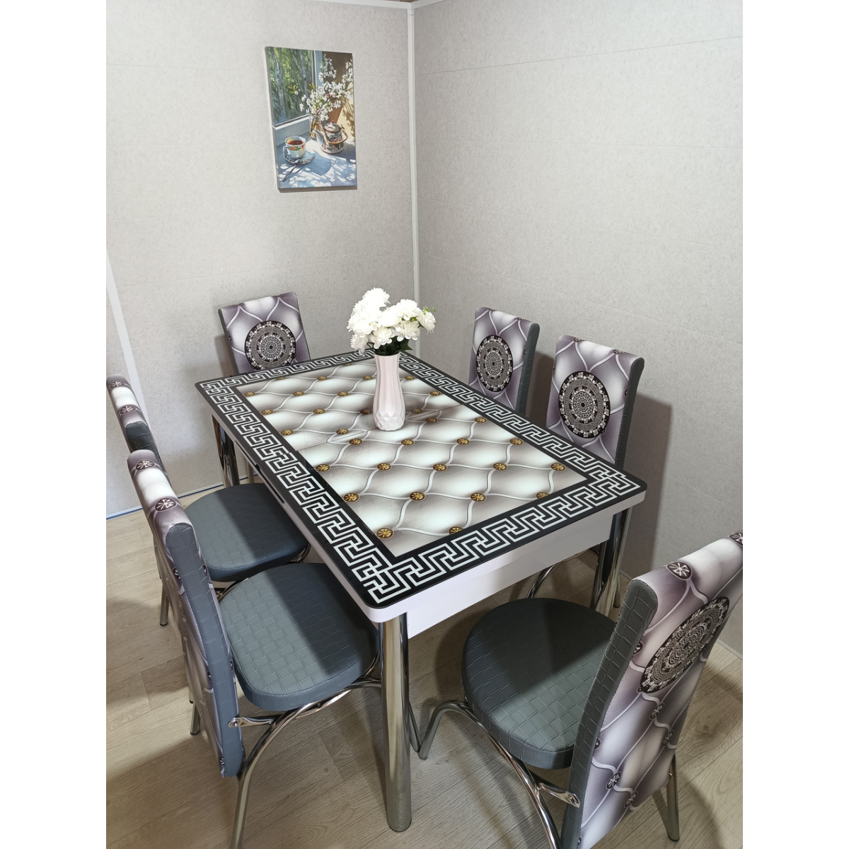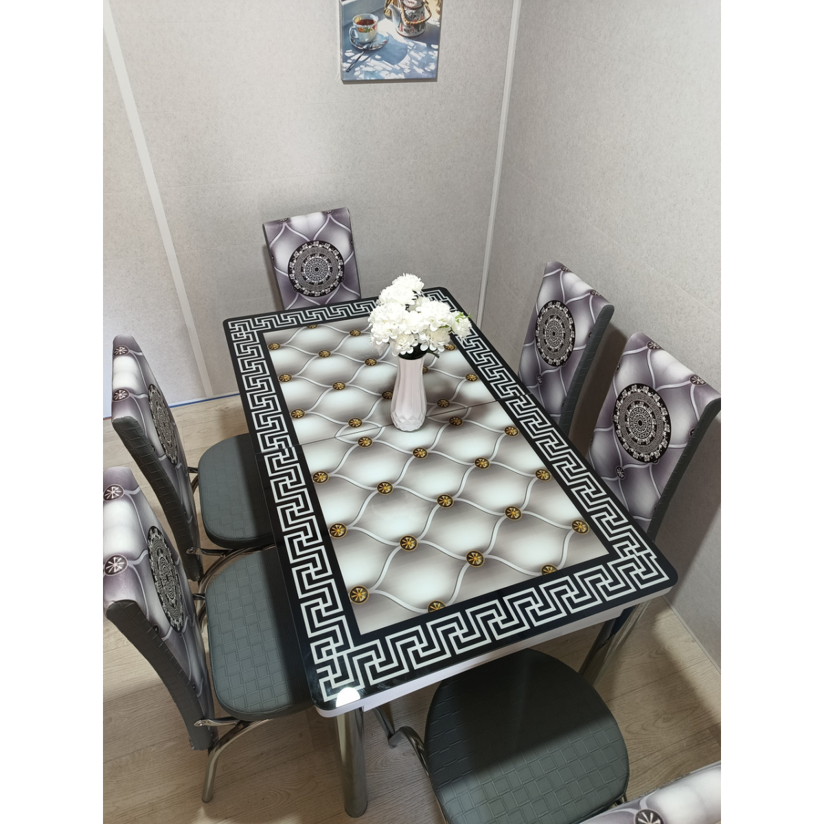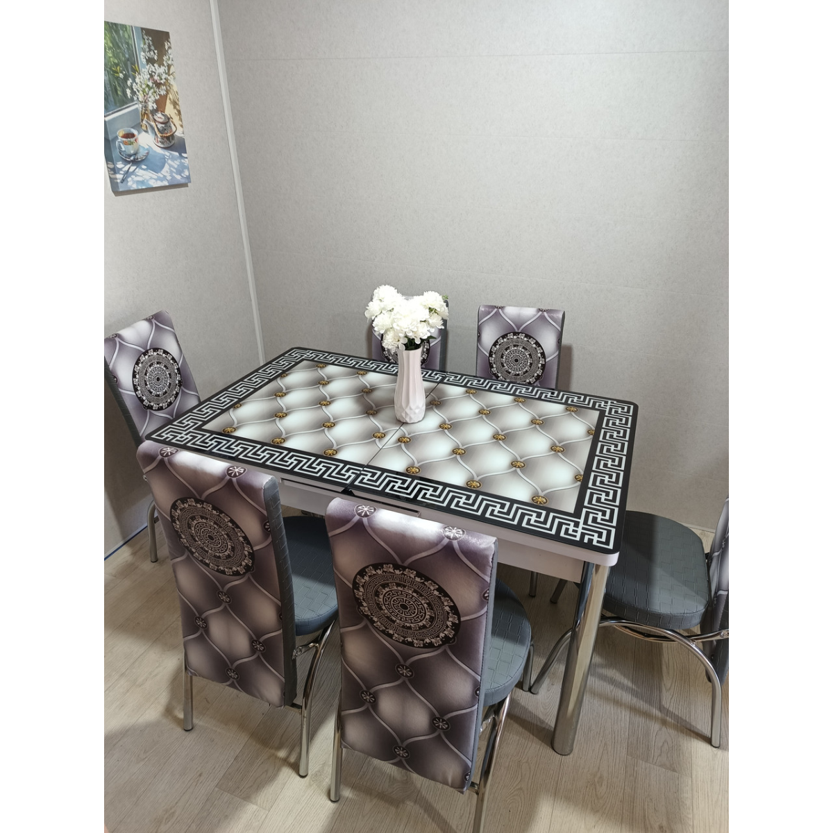 Комплект меблів для кухні з оригінальним декором! Розкладний стіл (130 см (+40 см) * 80 см) і 6 стільців!