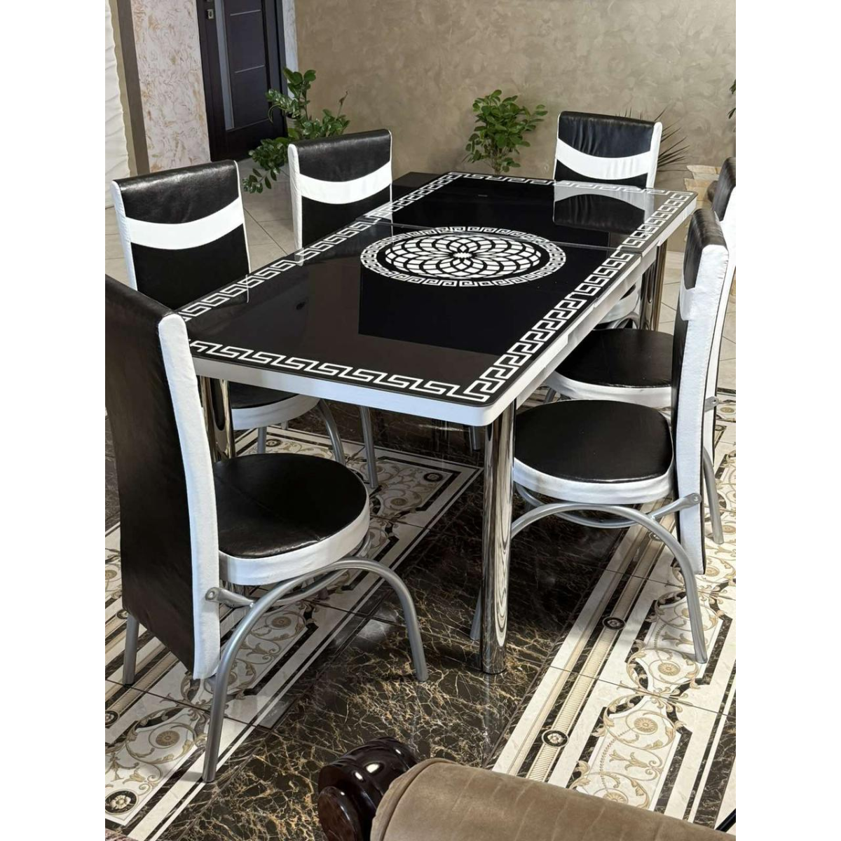 - Дана модель столу зроблена з міцного загартованого скла, захищений від механічних пошкоджень з 3 D малюнком + МДФ плита, каркас столу виготовлений з металевої конструкції, яка міцно скручується з металевими ніжками і з часом не розхитується - Ніжки столу і стільців виконані з хромованої сталі з заглушками - Високоякісна фотодрук на стільницях