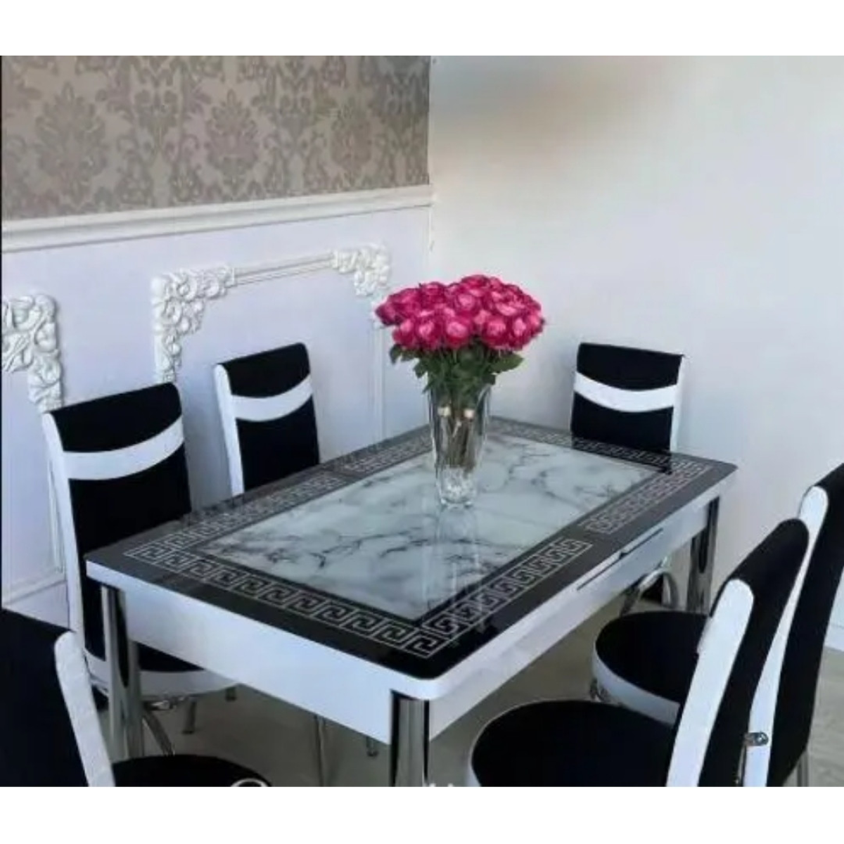 - Стільниця виготовлена з міцного загартованого скла, захищеного від механічних пошкоджень із 3 D-малюнком + МДФ плита — Ніжки столу та стільців виготовлені з хромованої сталі з заглушками — Високоякісний фотодрук на стільницях
