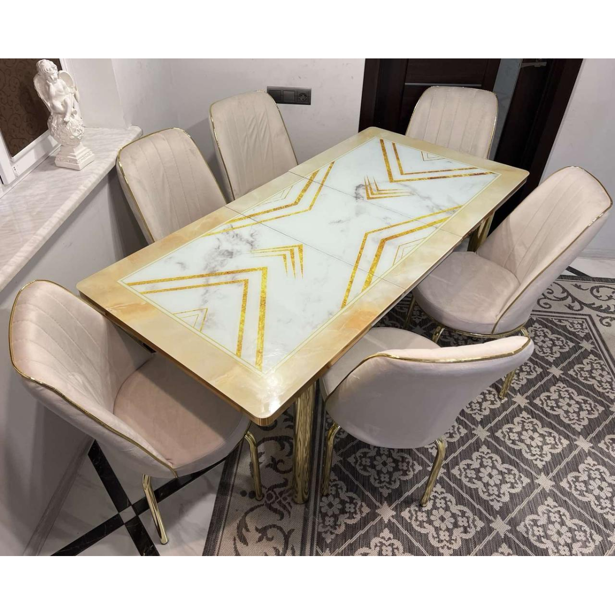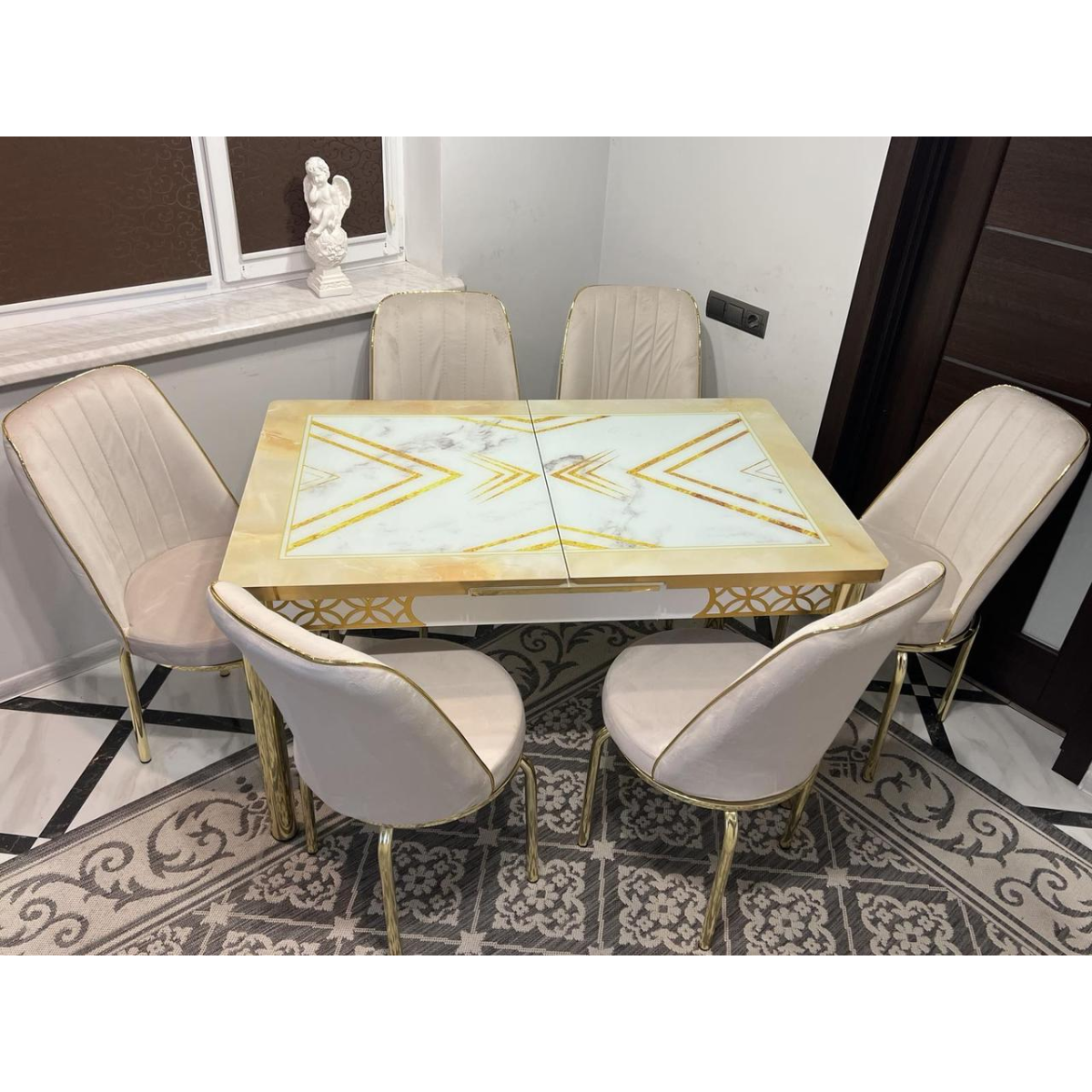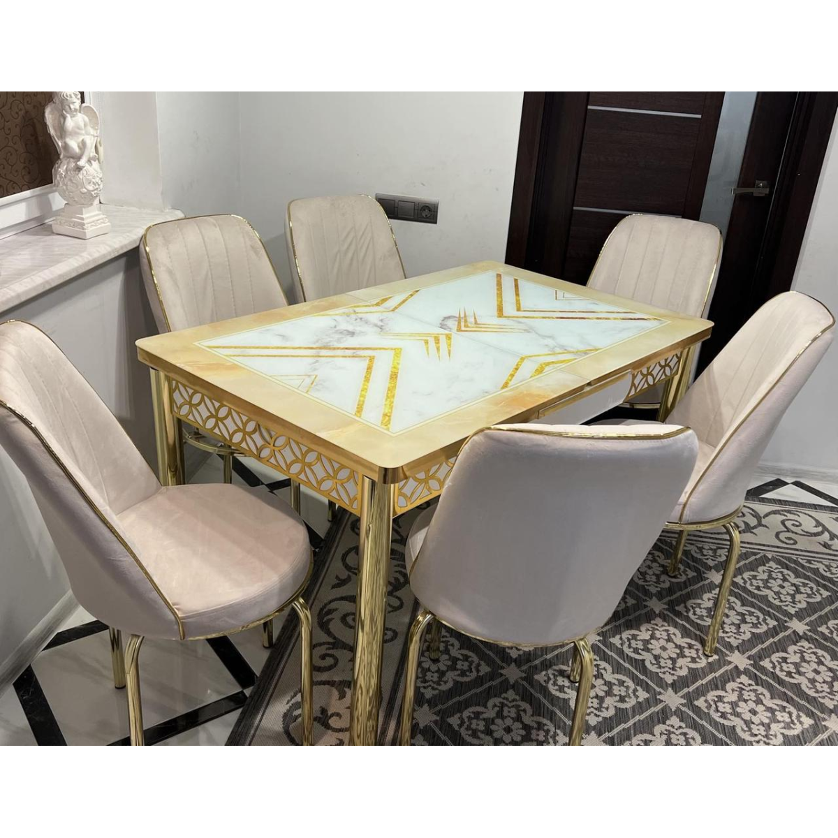 Розпродаж! Обідній Комплект розкладний стіл зі скла та 6 стільців Металевий каркас Туреччина