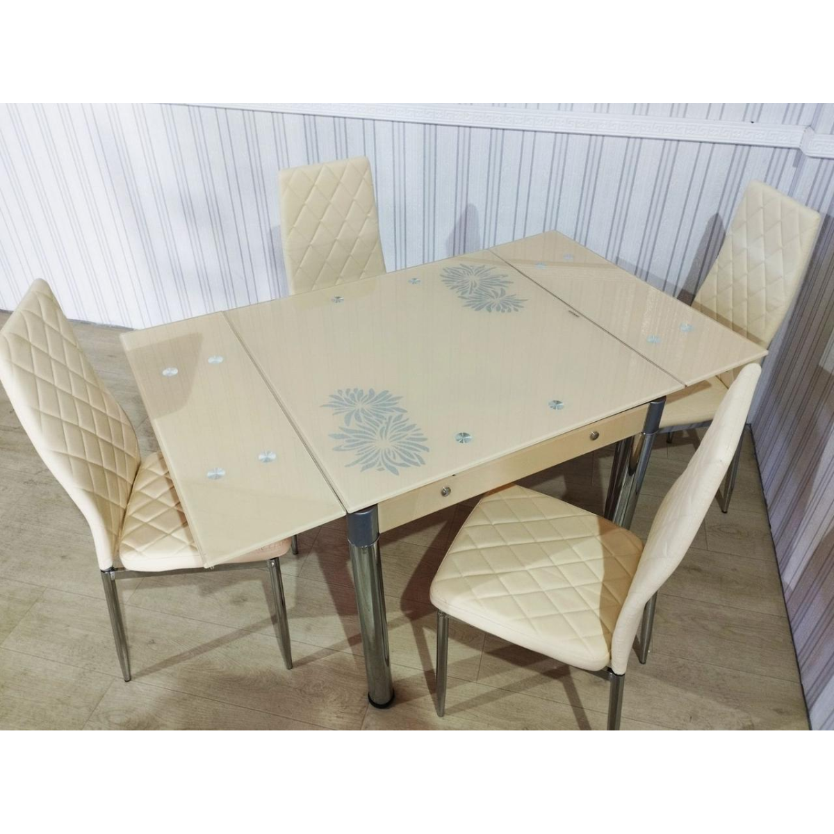 Обідній комплект. Стіл +4 стільці. Розкладний. Скло. 80*80+30+30см