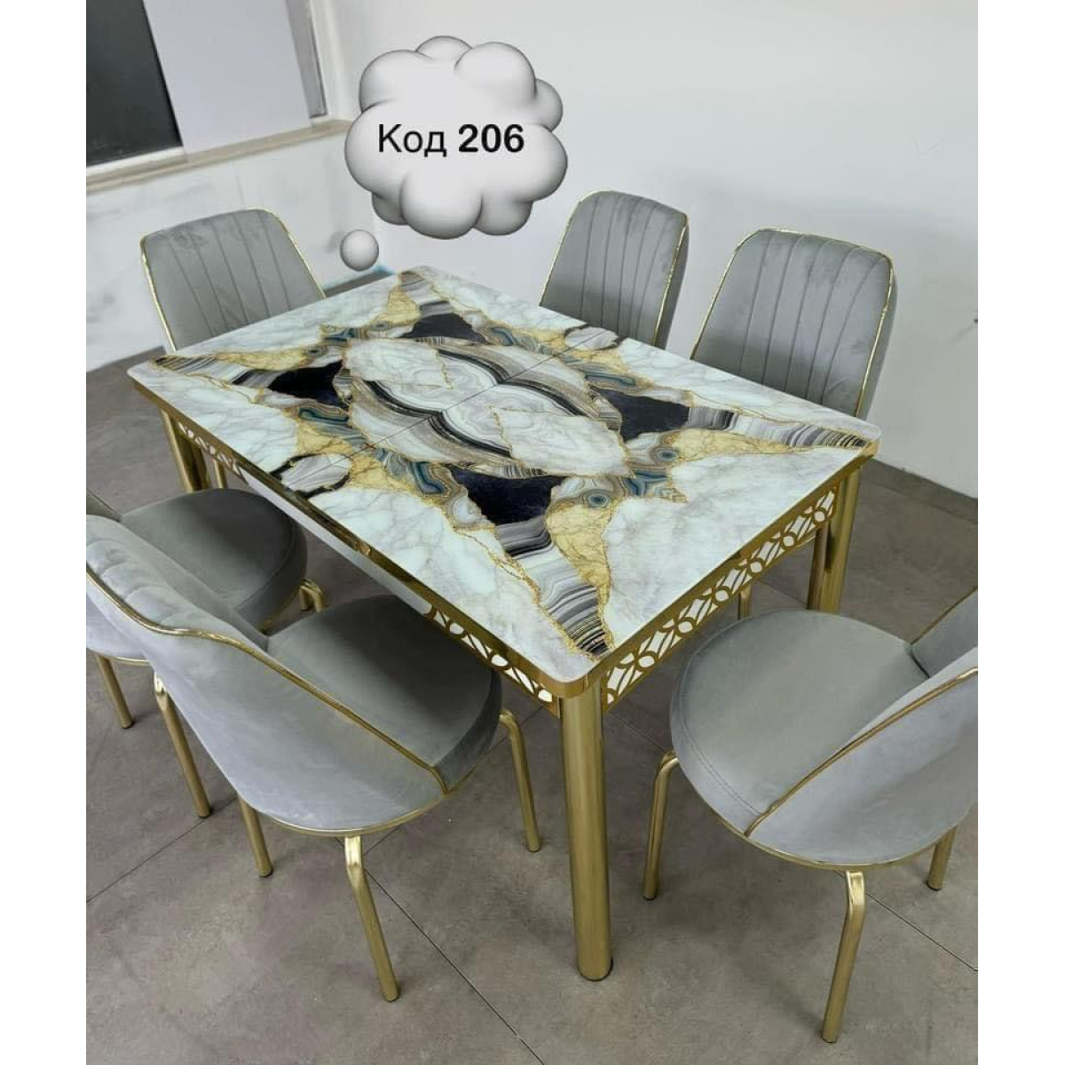 Комплект меблів для кухні з оригінальним декором! Розкладний стіл і 6 стільчиків Надсилання товару всією Україною накладеним платежем (з передплатою) на Нову пошту. Також можливо оформити кур“єрську доставку Ця модель столу виготовлена з ламінованого ДСП, ніжки столу та стільців металеві Розміри столу: ширина 80 см * довжина 130 см, у розкладеному вигляді 170 см Стільці: сидіння і спинка м“які. Зроблені з якісного щільного велюру. Серед переваг таких меблів: стабільність у разі впливу високих температур; несприйнятливість до вологості; забруднення не можуть проникнути в структуру матеріалу; довговічність; безпека, унікальний, чудовий зовнішній вигляд, доречна в інтер“єрах усіх стилів і поєднується з усіма матеріалами; у догляді можна користуватися звичайними мийними засобами