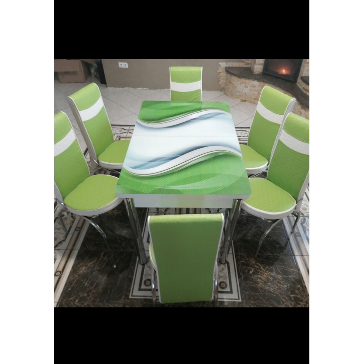 - Ніжки столу та стільців виготовлені з хромованої сталі із заглушками — Високоякісний фотодрук на стільницях